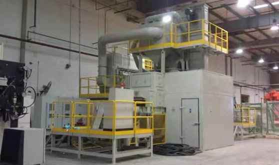 鑄件通過(guò)懸掛,軌道或滾子輸送到噴砂機(jī)室,工件連續(xù)旋轉(zhuǎn)并在室內(nèi)滾動(dòng)。在拋丸機(jī)的清潔室周?chē)惭b了布局合理的噴砂機(jī),噴砂機(jī)可以加速金屬?gòu)椡璧膾伾?。通過(guò)強(qiáng)烈的金屬?gòu)椡铔_擊,可以有效地清除砂子和拋光,同時(shí)可以對(duì)有缺陷部件的鑄件進(jìn)行篩分,并提前暴露氣孔,避免后期潛在的安全隱患。
